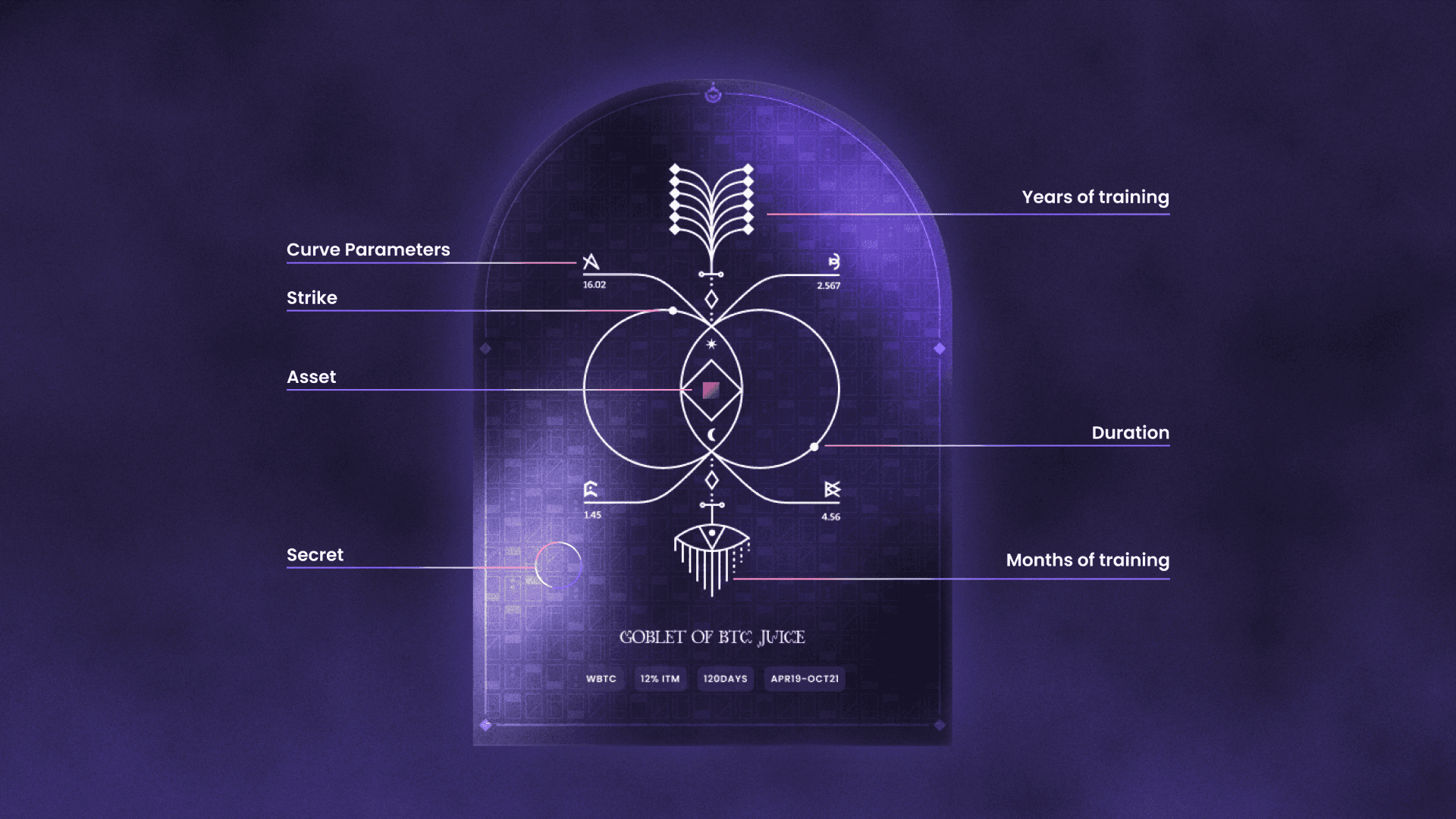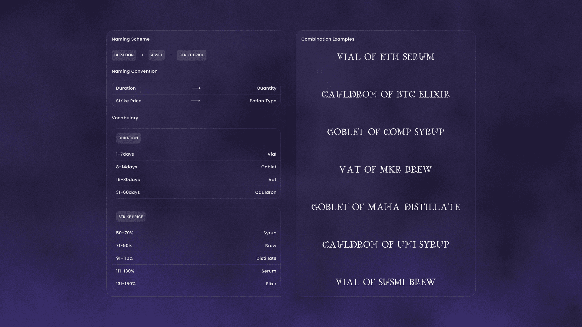 Naming followed a predefined transformation logic, translating financial parameters into metaphorical “potions”. Duration, asset, and strike were converted into vessel size and power levels—bridging quantitative finance with symbolic language.