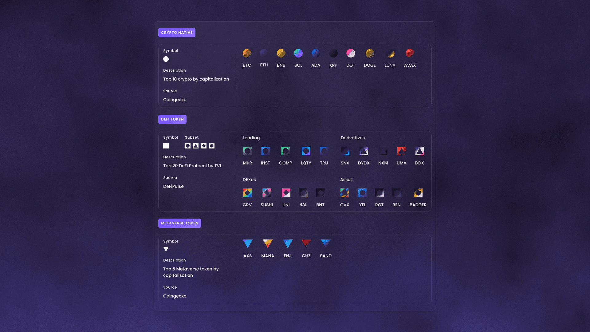 These categories were defined based on market relevance and protocol impact, then translated into distinct visual symbols and color treatments. This layer established the NFT’s economic context and positioned it within the broader Web3 landscape.