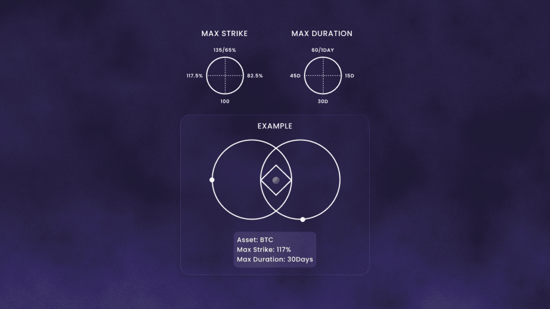 Strike price and coverage duration were visualized through overlapping circular geometries surrounding the asset. These parameters defined the risk profile of the option—ranging from deep in-the-money to out-of-the-money coverage and from short-term to extended durations.