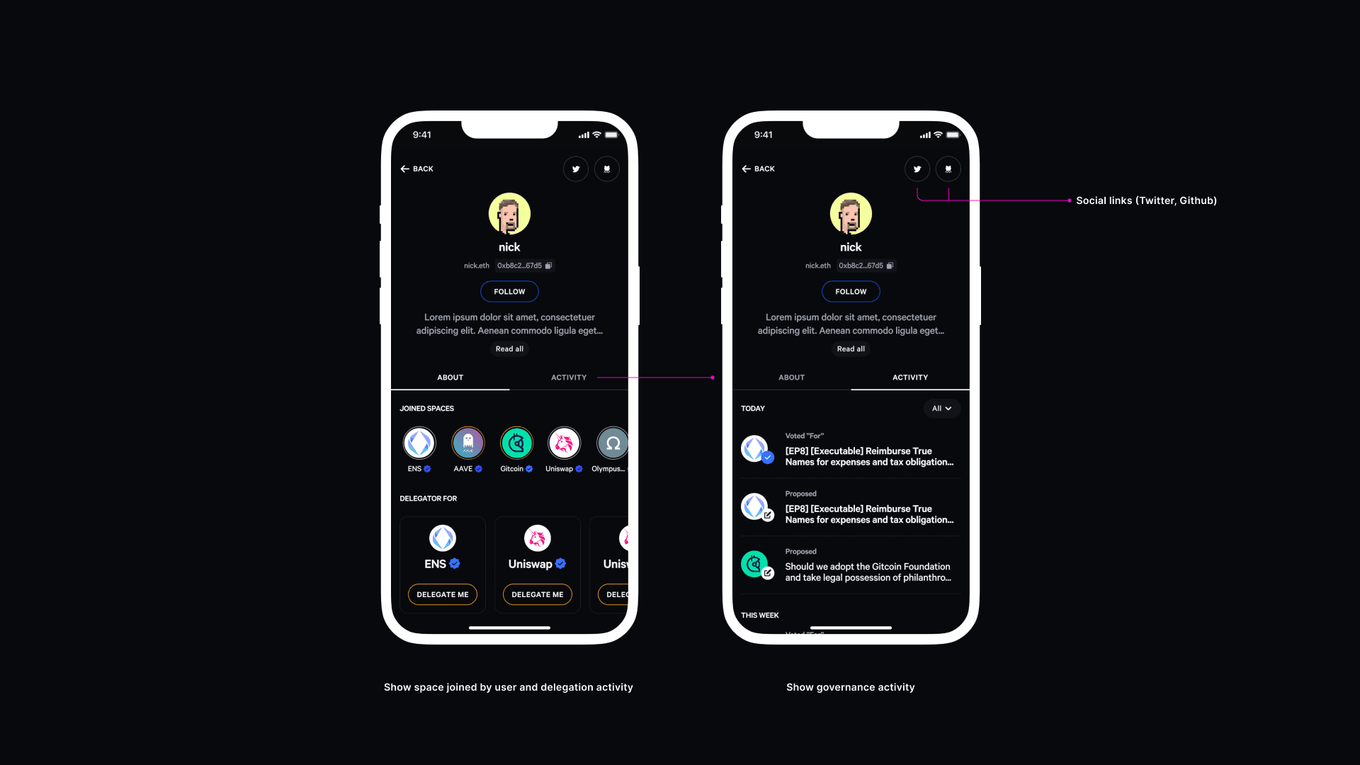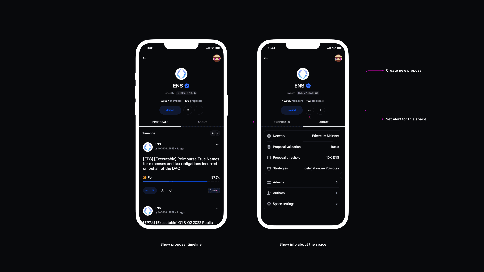 Profiles define governance identity across the app. Space profiles represent DAOs and their activity history, while wallet profiles represent individuals and their participation footprint. Together, they create a relational model that connects communities and contributors within the governance ecosystem.