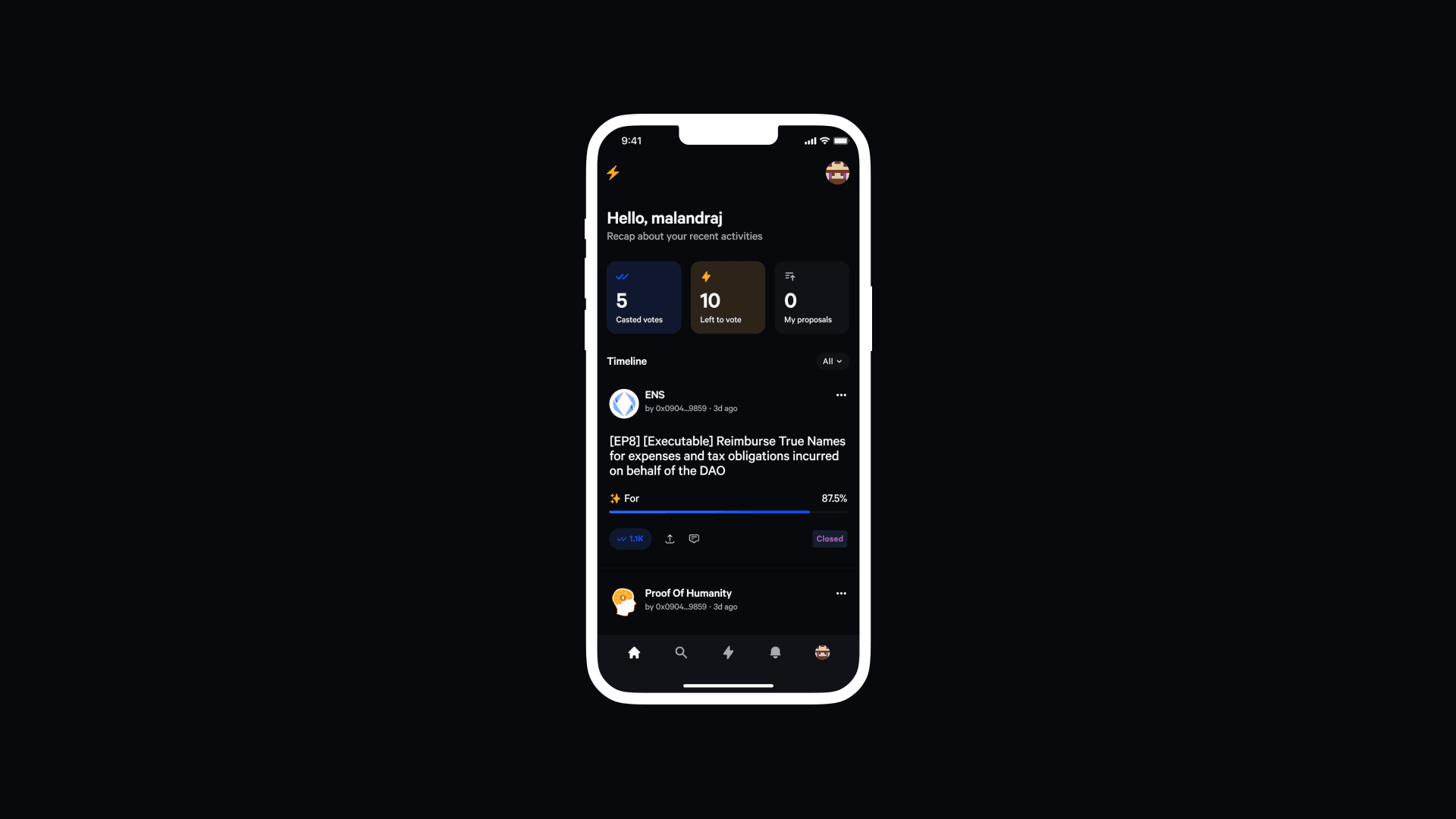 Once connected, users land on a personalized timeline composed of proposal updates and activity summaries from the spaces they follow. Instead of replicating a complex DAO dashboard, the goal was to create a focused stream of governance moments that feel timely and actionable.