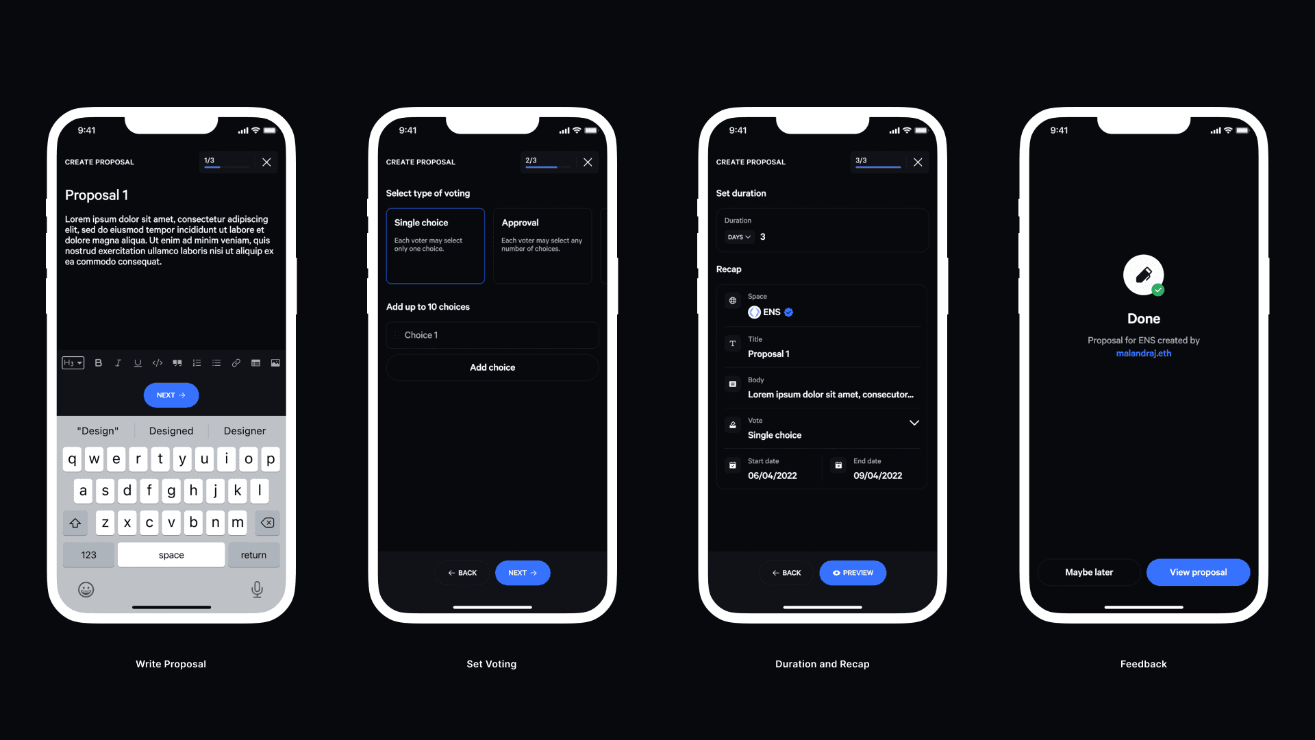 Proposal creation was structured as a guided three-step flow: defining intent, configuring voting, and reviewing parameters. This staged approach reduces cognitive load while maintaining compliance with governance requirements before submission.