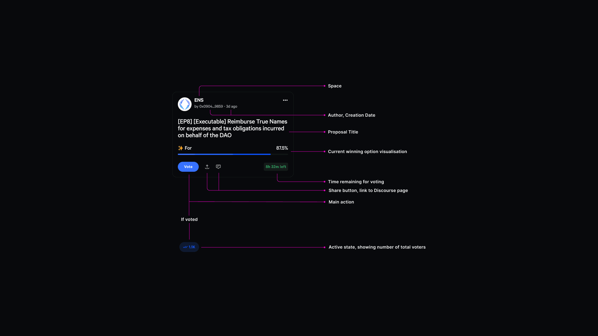 Proposal cards were designed to surface essential information at a glance while minimizing cognitive load. Each card highlights proposal title, status, voting progress, and time sensitivity—prioritizing signals that help users quickly decide whether to engage.