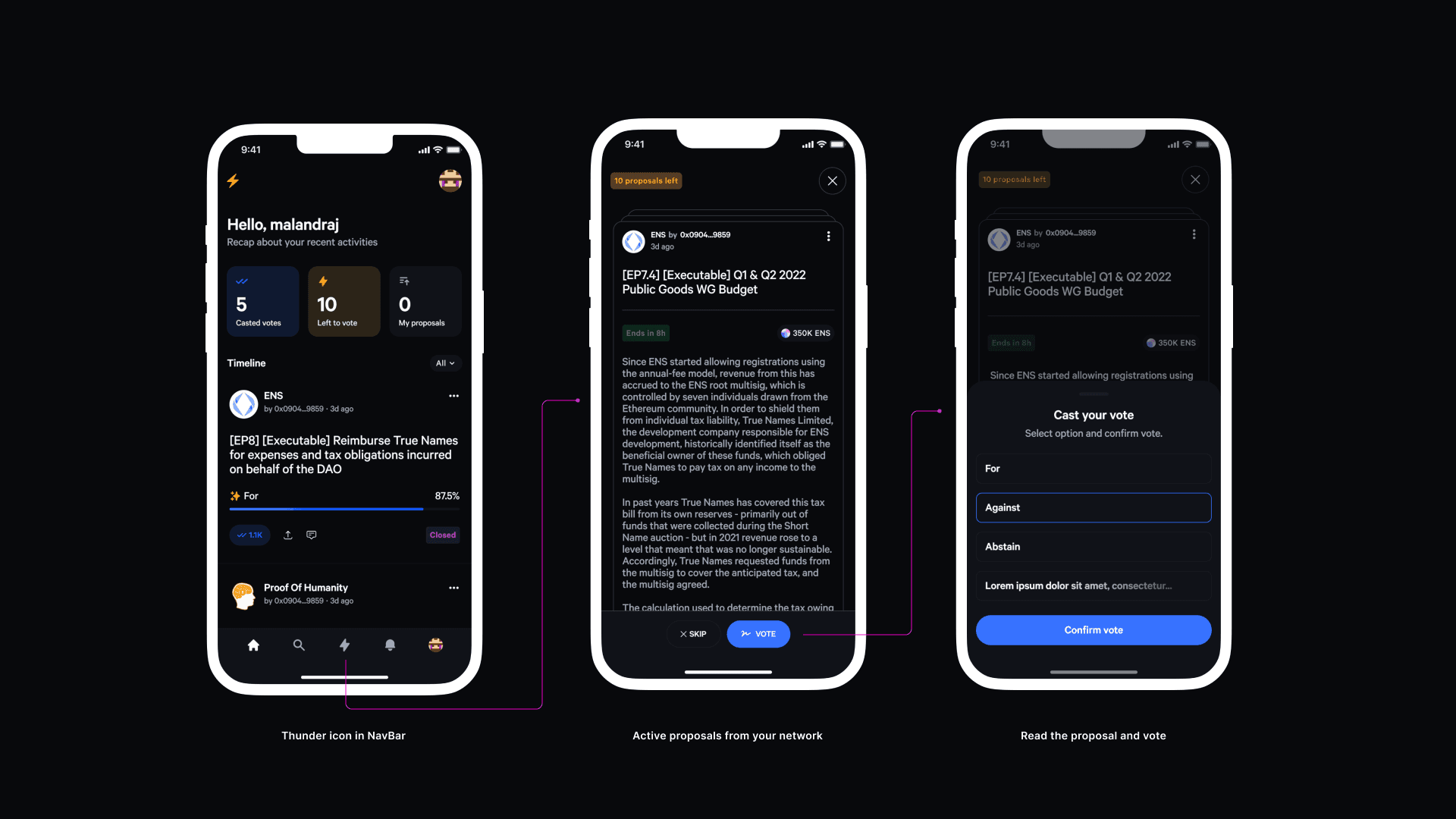 Inspired by familiar swipe-based interactions, the experience allows users to review proposals one at a time and either skip or cast a vote. A visible counter indicates how many proposals remain, reinforcing progress and encouraging completion.