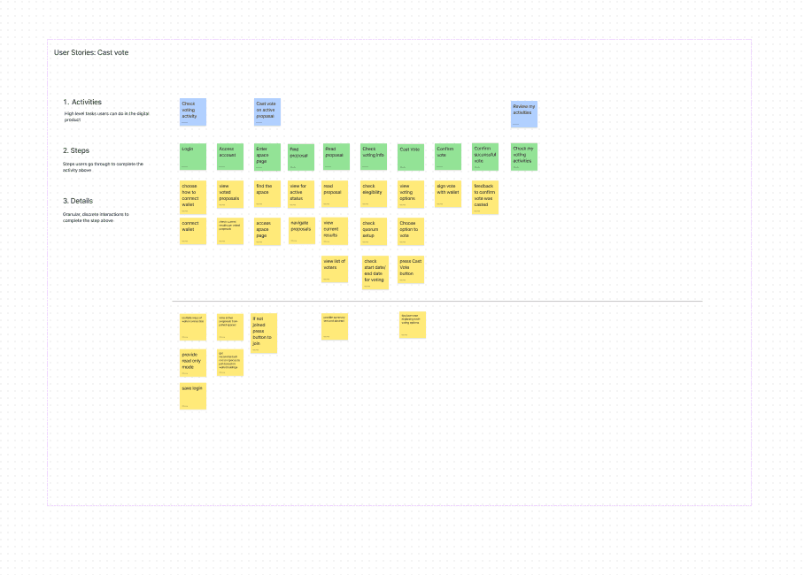 Early research activities focused on identifying friction in governance participation, information overload, and hesitation during voting flows. Insights informed simplification of structure, hierarchy, and interaction patterns.