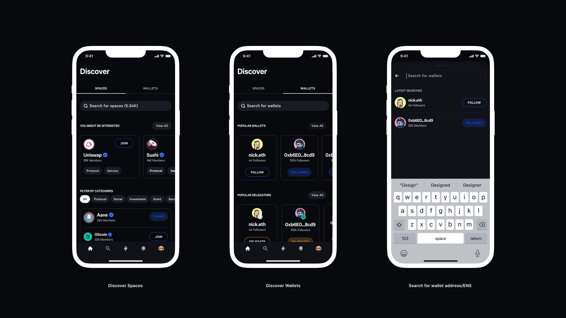 The app introduces two complementary discovery paths: exploring spaces and exploring wallets. This dual structure reflects the social nature of governance—where users engage not only with proposals, but with communities and individuals shaping decisions.