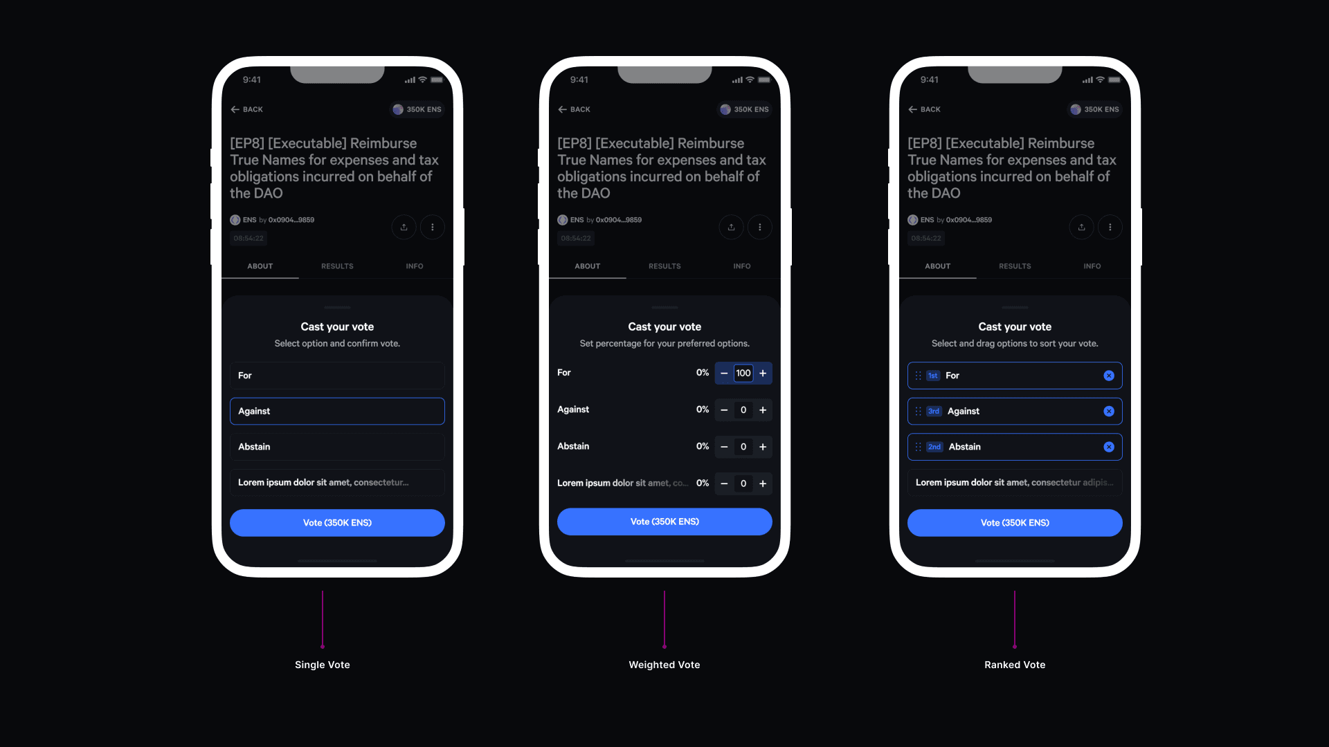 Governance on Snapshot allows each space to define different voting mechanisms per proposal. The mobile experience had to accommodate this variability while maintaining clarity and consistency.