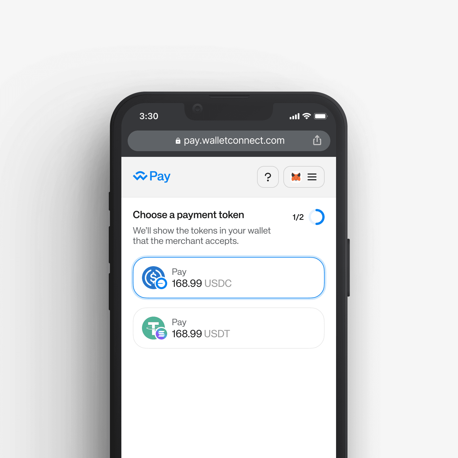 The system fetches the user’s wallet balance and displays only the tokens supported by the merchant with sufficient funds to complete the payment.